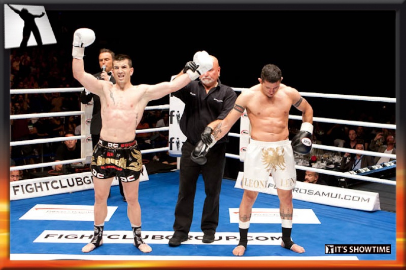 El ocho veces Campeón del mundo de kick boxing Abraham “el demonio” Rokeñi venció a los puntos ( 4 a 1) al armenio Gago Drago en una pelea programada a tres asaltos en los 73 kilos máximo y disputada en el palacio de los deportes de Madrid dentro de la velada del 54º It´s Show time, la imagen recoge el momento de la proclamación.