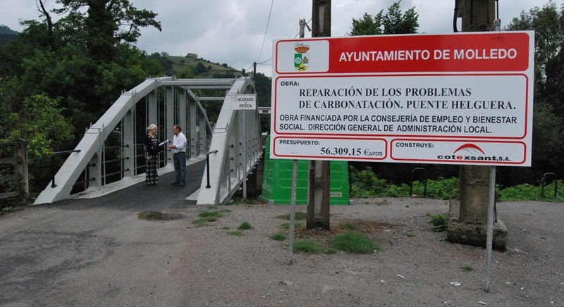 La restauración de un puente único en Cantabria, como es el de Helguera de Molledo, no ha dejado indiferente a nadie. Especialmente a la Junta Vecinal y sus parroquianos, "escandalizados" con el resultado de la obra. Hasta tal punto que esa Junta Vecinal ha encargado un estudio técnico por entender que se ha podido modificar la estructura de un puente calificado como bien singular. Y es que presenta una particularidad en su construcción, está suspendido por tirantes, algo que lo convierte en único en Cantabria. Lo que nadie niega es que era necesario actuar en un puente que presentaba un estado alarmante de aluminosis, situación agravada con los años que había llegado ya a un punto de peligrosidad que requería una actuación urgente. Por esa razón habían sido muchos los intentos de contar con financiación para su reparación. Muchas corporaciones habían buscado ese apoyo económico, hasta que en la pasada legislatura la Dirección General de Administración Local dio el visto bueno a una inversión cercana a los 60.000 euros para reparación y consolidación del puente. Lo que se ha hecho es aplicar un tratamiento especial contra la degeneración del hormigón, además de procederse a su limpieza y aplicación de pintura muy similar al color originario. También se han cambiado por completo las barandillas que se encontraban muy deterioradas y se ha procedido al fresado y asfaltado del firme. Y ahí se enfrenta la opinión de los vecinos, que aseguran no sentirse identificados con el resultado y solicitan, ante la junta y el Ayuntamiento, que se devuelva al puente su antigua imagen, no tan "moderna" como la actual. Incluso han criticado el asfaltado de un puente "clásico" como ese, cuando "se tenía que haber tirado de imaginación para aplicar otra solución". Advierten, por si queda alguna duda, de que "la cosa no va a quedarse así con un icono de nuestro pueblo".