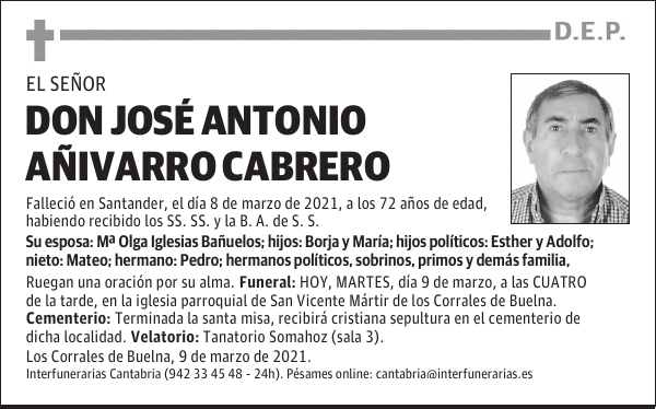 Ha sido muy duro escuchar el testimonio de María Añívarro. Su padre, José Antonio Añívarro Cabrero, `Potono´ para todos los corraliegos, murió el pasado 8 de marzo a consecuencia del Covid 19. Las palabras de María, en la entrevista de Nacho Cavia para A los 4 Vientos de hoy 19 de mayo, han sido tan claras como necesarias en este momento en el que Los Corrales encabeza la lista de peores datos de contagio en Cantabria. Gracias a ella por su valentía y un abrazo para toda la familia.