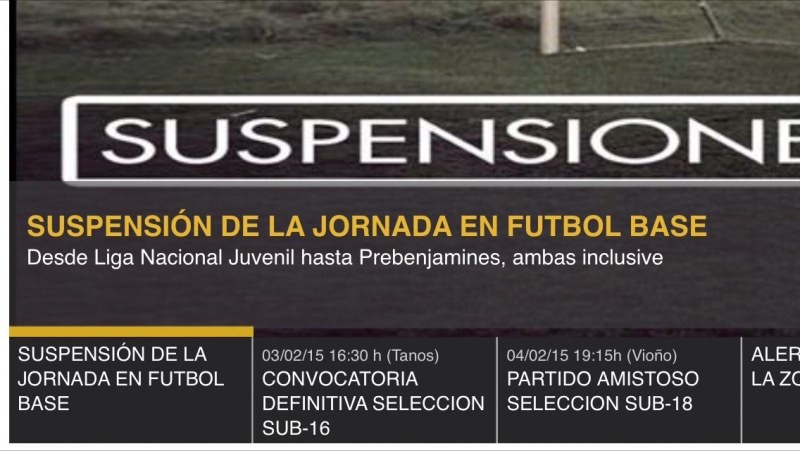 Debido a las adversas condiciones climatológicas queda suspendida la jornada en Fútbol Base tanto de campo como de sala (desde Liga Nacional Juvenil hasta Prebenjamines, ambas inclusive y Regional Preferente Femenina.