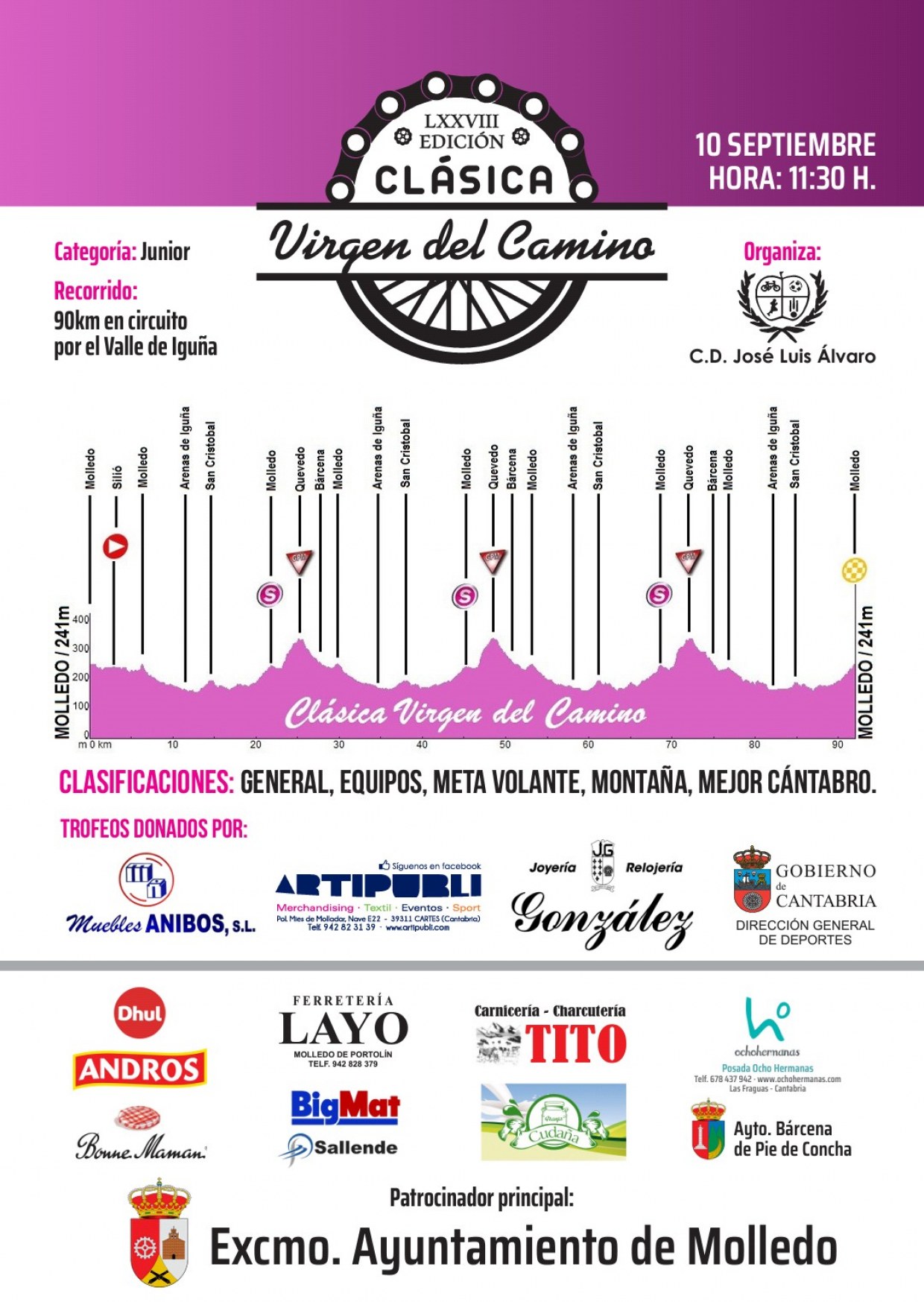 La carrera de ciclismo más longeva de Cantabria, y una de las más antiguas del panorama nacional, se celebra este viernes 10 de septiembre, encuadrada en las fiestas patronales de la localidad iguñesa. La 78ª Clásica Virgen del Camino llega en este 2021 de la mano del trabajo de Carlos González y su equipo del C.D. José Luis Álvaro, y tendrá 91 kilómetros de recorrido por el Valle de Iguña, con el Alto de Quevedo y sus tres pasos como dificultad montañosa de la jornada, y los tres pasos por Molledo, escenario puntuable de la clasificación de los sprint especiales. La prueba, de categoría junior, se inicia a las 11:30 horas, y cuenta con el apoyo del Ayuntamiento de la localidad. Roberto Alonso, del Bathco, reciente ganador de la Copa de España, o el campeón regional en ruta, Iván Manuel Bonilla (MMR), son a priori, los grandes favoritos para lograr el triunfo.