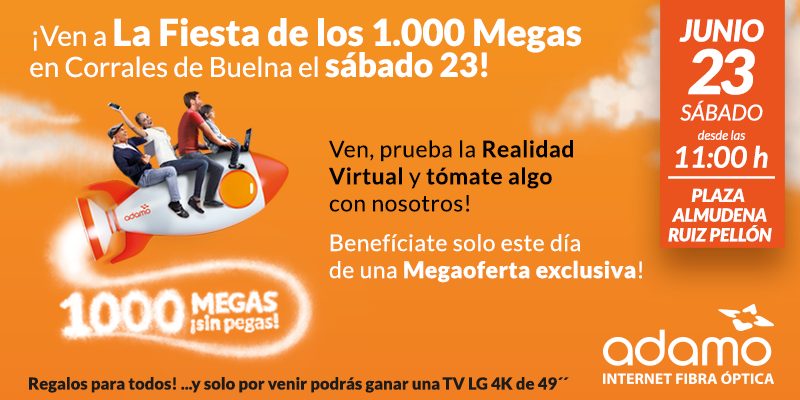 El operador de fibra óptica Adamo ya da servicio en numerosos hogares de Los Corrales de Buelna. El sábado 23, en plenas fiestas de San Juan, montará la `Fiesta de los 1000 Megas´ y estamos todos invitados a acudir. Una carpa situada en la plaza de Almudena Ruiz, detrás del Teatro Municipal, mostrará realidad virtual y exhibirá novedades en nuevas tecnologías. Nos hemos enterado de que habrá regalos para todos.