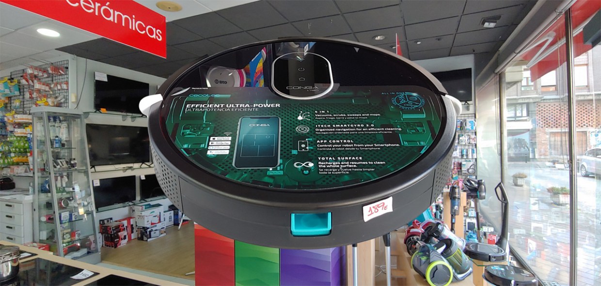 *El Conga 1790 Ultra es un robot aspirador automático que friega, aspira y barre a la vez. Tiene los últimos avances como APP con mapa, limpieza ordenada de la totalidad de la superficie recorrida, cepillo para mascotas, muro magnético y es compatible con Alexa y Google Assistant. Ya lo pueden ver expuesto en el escaparate de la tienda de la calle Campoo.