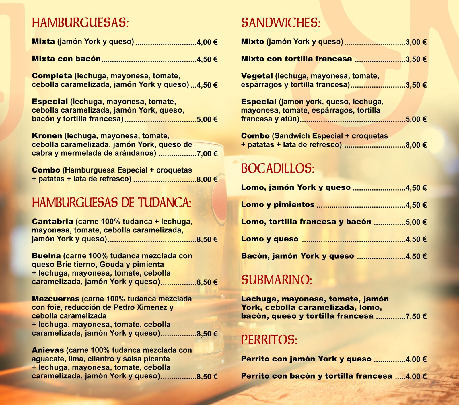 - Los dos combos llevan sándwich o hamburguesa especiales + croquetas + patatas + refresco.