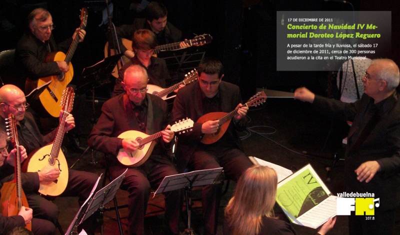 A pesar de la tarde fría y lluviosa, el sábado 17 de diciembre de 2011, cerca de 300 personas acudieron a la cita en el Teatro Municipal. El concierto empezó con la actuación de María José González Ruiz y su marido Tom Fernández. Ella es violinista y él acordeonista y pianista, ambos profesores de música. Interpretaron temas con sonido de violín y piano y otros en formando conjunto de violín y acordeón. La sorpresa que celosamente habían guardado desde la organización apareció entonces en escena. Se trataba de un montaje audiovisual que presentaba fotografías antiguas, música y explicaciones sobre la vida de D. Doroteo `el organista´. Seguidamente intervino la joven Escuela Municipal de Cuerda y después la Agrupación de Pulso y Púa Fresneda. Resultaron muy destacadas y premiadas con los aplausos del público, las canciones navideñas en la voz de sus solistas Reyes Bengochea, Benito Díaz y Luis Cuartas.