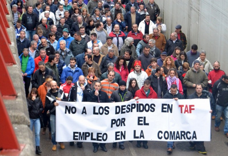 Cerca de 300 personas se sumaron este viernes al Comité de Empresa de la factoría TAF, en San Felices de Buelna, como protesta por los 30 despidos anunciados por la dirección en un ERE de extinción de empleo comunicado a los trabajadores hace unos días. Tras una pancarta que rezaba 'No a los despidos de TAF, por el empleo en la comarca' la manifestación partió de las oficinas principales del grupo al que pertenece la empresa, Leading Enterprises, en la recta de la Agüera de San Felices, para dirigirse al Ayuntamiento de Los Corrales de Buelna, donde el comité de empresa y los representantes sindicales expusieron ante la alcaldesa, Mercedes Toribio Ruiz, la situación de una factoría sobre la que pesa un expediente de extinción de 30 puestos de trabajo, la mitad prácticamente de los 66 empleados de la factoría.