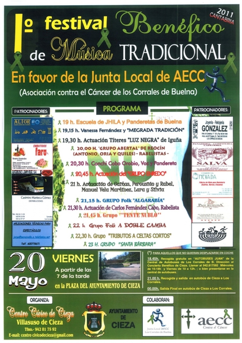 Este viernes día 20 mayo, desde las siete de la tarde, organizado por el Centro Cívico de Cieza, con la colaboración del Ayuntamiento de Cieza y la Asociación Española contra el Cáncer de Los Corrales de Buelna, se celebrará en la plaza del barrio de la Rueda, frente a la Casa Consistorial, un Festival Benéfico a favor de la Junta Local de la Asociación Contra el Cáncer de Los Corrales de Buelna. El espectáculo será muy variado y no faltará música tradicional con panderetas, rabel, gaitas, grupo folk. También habrá, para abrir el evento, teatro de marionetas a cargo del grupo `Luz negra de Iguña´. Para recaudar fondos se venderán papeletas a sólo un euro y darán derecho a participar en el sorteo de regalos donados por comercios de la comarca. También se instalará un bar con el mismo fin. La organización ha dispuesto un autobús que saldrá de la parada de Los Corrales de Buelna a las 18,45 horas. El programa es muy variado: