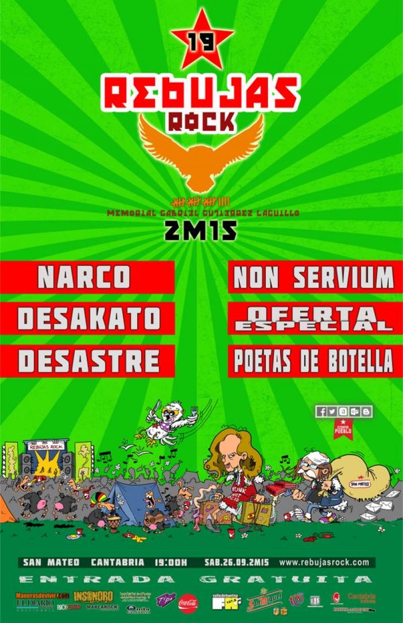 Este año serán Non Servium, Narco, Desakato, Oferta Especial, Desastre y los cántabros Poetas de Botella los que se suban al escenario el próximo sábado 26 de septiembre a partir de las siete de la tarde en San Mateo. Abajo, en la campa del polígono de Los Corrales, se espera la presencia de más de 12.000 personas entregadas con la oferta que cada año preparan desde la Asociación Cultural y Deportiva Rebujas, encargados de dar continuidad a un encuentro que se mueve contra viento y marea, creciendo en importancia a pesar de su carácter totalmente gratuito.