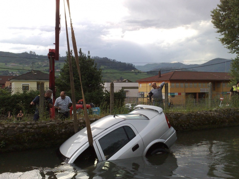 A las seis de la tarde de hoy miércoles 25 de mayo, circulaba por las inmediaciones del Complejo Deportivo de Los Corrales en dirección a la calle Torres Quevedo, un Opel Astra conducido por una joven. Por circunstancias que se desconocen se salió de la carretera en la subida que da acceso al puente sobre el canal. Aunque testigos del accidente han relatado que circulaba a una velocidad moderada, la conductora novel, no pudo controlar el coche que se salió por la derecha en plena cuesta arriba, saltó un bordillo de más de 20 centímetros, atravesó varios metros y derribó una protección de tela metálica para acabar saltando al canal. (Ver fotos inferiores) Por fortuna el joven que la acompañaba en el vehículo pudo ayudarla y ambos consiguieron abandonar el coche y salir del canal, mojados y con un susto impresionante, pero en buen estado. Una ambulancia les llevó al Centro de Salud Buelna. Instantes después del accidente llegó una patrulla de la Policía Local y dos camiones de bomberos del Parque de Emergencias de Los Corrales. En ese tiempo el coche aún no se había hundido y la corriente lo arrastró más de 250 metros hasta que quedó encallado en el barro del fondo del canal. La maniobra de rescate del vehículo fue dificultosa y los bomberos tuvieron que discurrir para lograr pasar una guía que atravesara el interior del vehículo sumergido entrando por una ventanilla delantera y saliendo por la otra. Después gracias a la guía se pasó una fuerte eslinga y un camión grúa se encargó del resto. El vehículo sufrió daños importantes. Como suele ocurrir en estos casos, el accidente reunió a un importante número de curiosos.