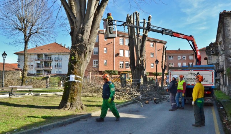Personal del Serca y del Ayuntamiento de Los Corrales de Buelna han iniciado esta semana la poda de 11 tilos de la plaza del Conde Mansilla por el riesgo de que rachas fuertes de viento como las anunciadas puedan no solo tirar ramas sino partir unos árboles con más de 70 años de vida que están por dentro en malas condiciones, incluso algunos abiertos verticalmente por el tronco lo que incrementa la peligrosidad de que se abran por la mitad.