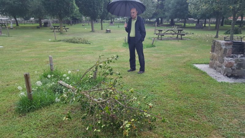 José Antonio González Linares estaba muy dolido por ese ataque a una de las joyas de la corona del patrimonio de San Felices de Buelna. Un parque de casi tres hectáreas de terreno donde a principios de siglo se plantaron más de medio centenar de distintas especies autóctonas y alóctonas, con cuatro ejemplares por especie. Para alentar la visita al parque se colocaron bancos, barbacoas, zonas de juegos para niños e incluso un área de máquinas de ejercicio para mayores y, recientemente, se había colocado un baño, que también se vio afectado por el ataque vandálico en la noche del viernes. Y para darle un aire educativo, se colocó también una placa de identificación en cada una de las especies arbóreas plantadas en ese parque. Muchas de las que ahora se han cortado habían arraigado ya y presentaban un buen aspecto, especialmente un olivo que además de cortado ha sido destrozado. En otros árboles el daño se ha quedado en la base, que ha sido pelada con la misma herramienta. La que no se ha visto afectada es la zona de árboles de gran tamaño.