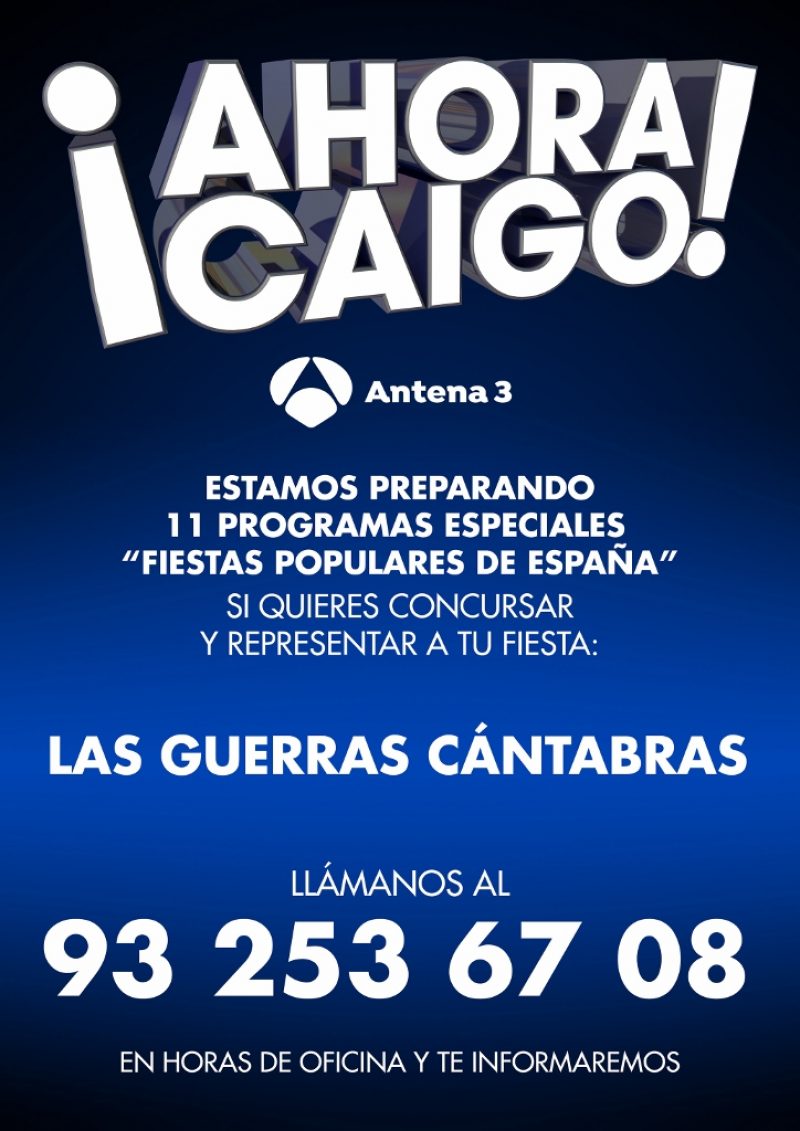 El concurso televisivo Ahora Caigo, de Antena3 Televisión, cambiará su plató para adecuarlo a la Fiesta de Interés Turístico Nacional de Guerras Cántabras, decorándolo de época y vistiendo a los concursantes y presentador, Arturo Valls, como cántabros y romanos. La producción del conocido programa se ha puesto en contacto con el presidente de la asociación cántabra, Óscar del Val, para ofrecer la participación de la recreación histórica en una edición especial junto a otras diez Fiestas de Interés Turístico Nacional, un "espaldarazo espectacular" para la celebración corraliega, en palabras de Óscar del Val.