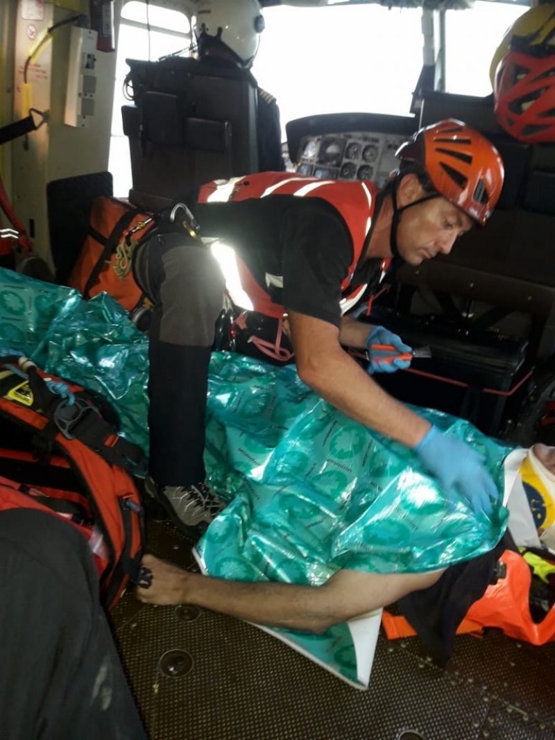 A la llegada de la aeronave al lugar han descendido hasta el afectado, un técnico de rescate del Gobierno y el médico que han realizado una primera atención de urgencia a la víctima, le han estabilizado y le han izado al helicóptero.