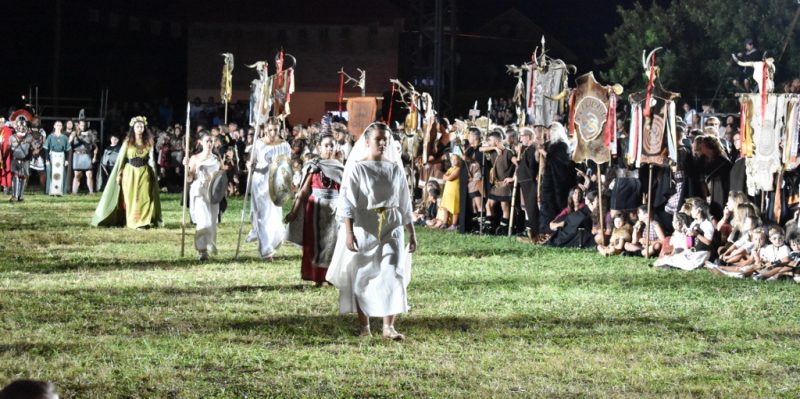 Ante ellos la Sacerdotisa Drusila y la Pitonisa Selenia fueron las encargadas de encender el Fuego Sagrado. Allí se dieron cita los personajes principales de las piezas teatrales que recrearán la historia, desde el Cesar a Corocotta, Agripa o Vadón, además de las citadas Drusila y Selenia, Antistio, las diosas Cantabria y Minerva o el druida Virón, todos en sus dos versiones, la adulta y la joven.