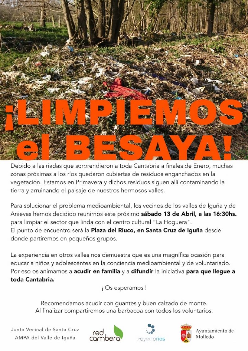 Las citas son en la plaza del Riuco de Santa Cruz de Iguña, en Molledo, para el río Besaya y en la plaza de Concha Espina de Mazcuerras para el Saja. Los ayuntamientos de ambas localidades y la junta vecinal de Santa Cruz de Iguña, además del AMPA del colegio Torres Quevedo apoyarán una iniciativa que espera contar con una alta participación de ciudadanos concienciados con la necesaria conservación de los espacios naturales.