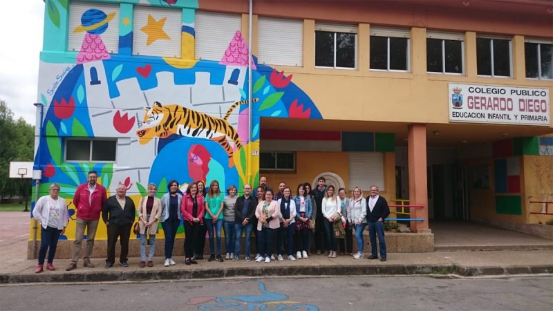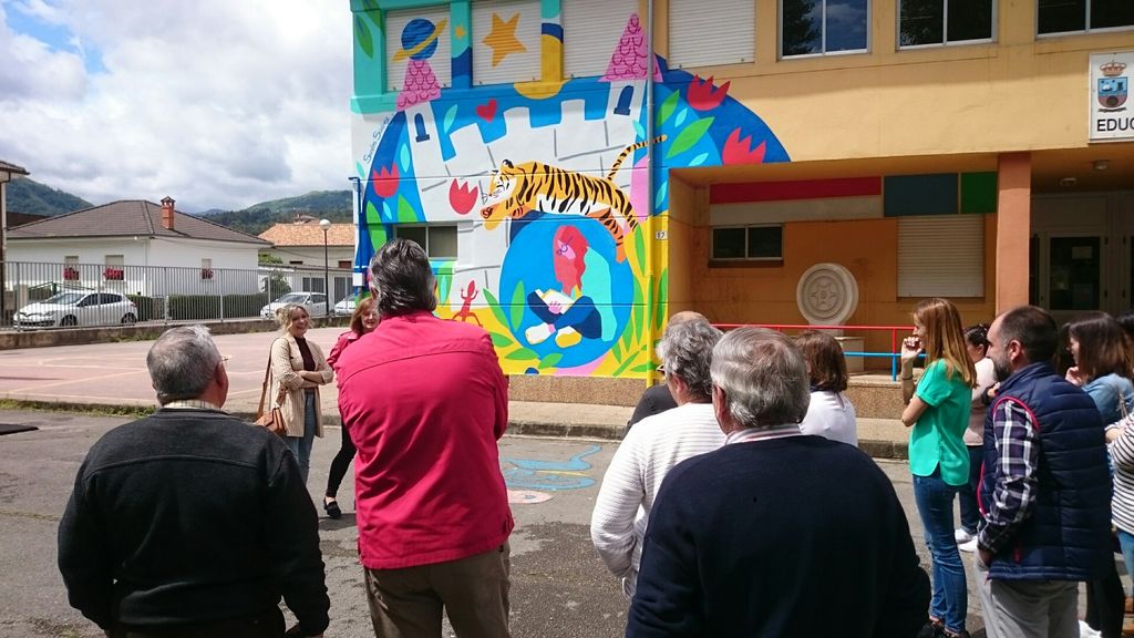 El colegio público Gerardo Diego de Los Corrales de Buelna ha cambiado de imagen, plasmando en su fachada, pasillos y biblioteca su principal proyecto educativo, la lectura, combinado con una de las actividades de este curso, la creación plástica. Lo más llamativo es el gran mural que ilustra su fachada principal, una forma de dar la bienvenida a cuantos se acercan a un centro educativo que apuesta por la importancia de los libros. Es un mural de gran formato, diseñado y plasmado por la artista corraliega Sandra Suárez, una pintura que supone "una colorista reivindicación del poder evocador de la lectura". Sus trabajos, merecedores de múltiples reconocimientos en los últimos años, han sido expuestos en diferentes ciudades de Europa, Asia o América, sin olvidarse de su pueblo natal, donde ya cuenta con varias manifestaciones bien visibles de su arte. Junto a ella estuvo la directora del centro, Argentina Pérez, la alcaldesa en funciones, Josefina González, el teniente de alcalde, Luis Ignacio Argumosa, la concejala Isabel Quijano, futuros concejales como Germán Arce, electo por el PP y la Isnpectora de Educación, Pilar Benedicto..