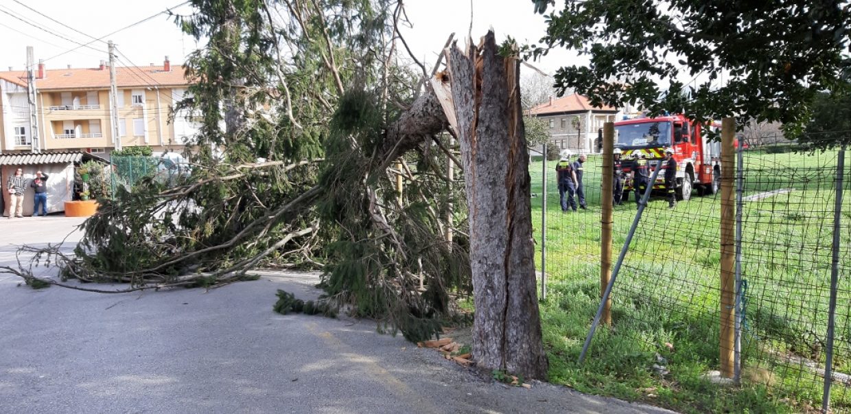 Los bomberos del parque de emergencias del 112 de Los Corrales de Buelna retiraron este domingo un árbol de la calle Numancia, un pino partido por la mitad por el viento que amenazaba a los viandantes y a una casa próxima. Hasta el lugar se desplazaron los voluntarios de Protección Civil y la patrulla de la Policía Local, que cortó el tramo de calle hasta que los bomberos pudieron retirar el árbol. No hubo que lamentar más daños materiales que los del propio pino, que por suerte cayó en un primer momento sobre otro pino de esa misma calle.