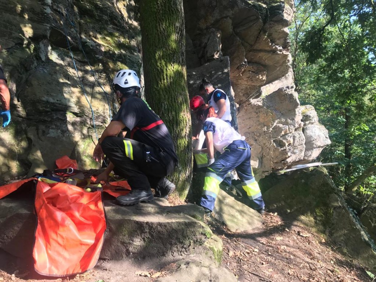 El afectado, con posible fractura de tobillo, ha sido porteado en camilla de rescate terreno con importante desnivel y firme irregular