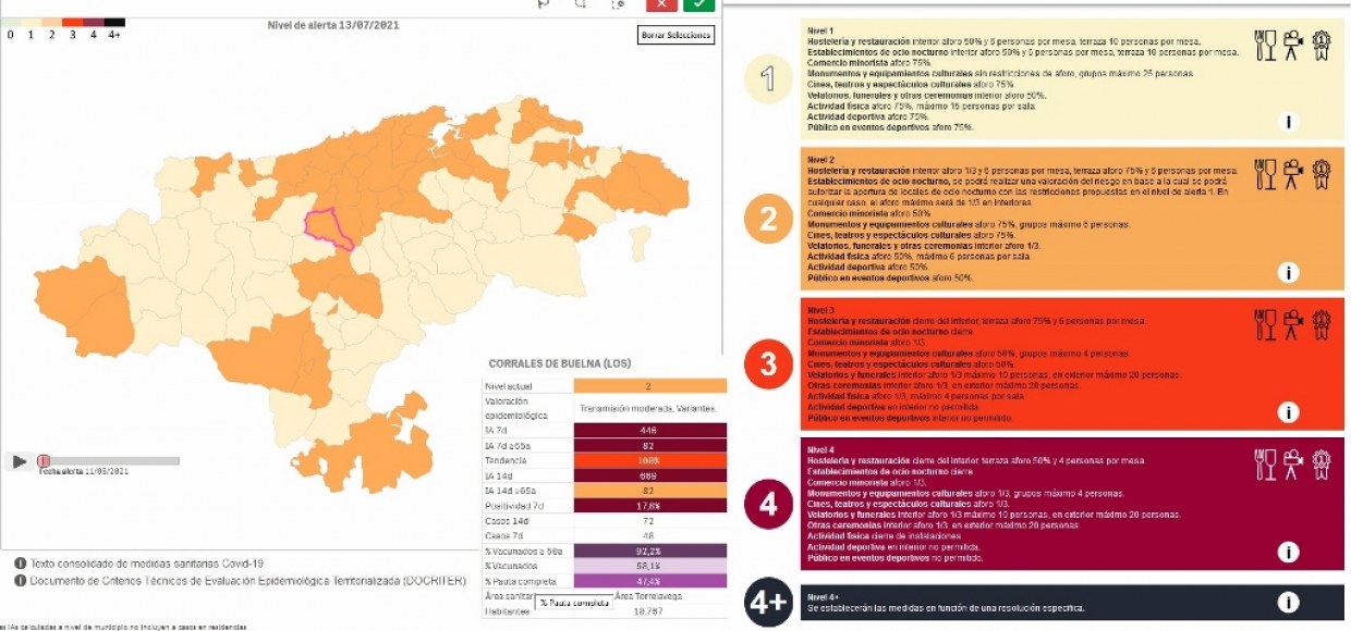 Un total de 47 municipios de Cantabria se sitúan esta semana en naranja (nivel 2) en el mapa de riesgo por Covid-19, 11 más que la semana pasada, debido a la tendencia creciente en el nivel de incidencia que registra la región. Entre los municipios que suben de nivel están San Felices de Buelna y Arenas de Iguña, que se suman a Los Corrales de Buelna, Cartes y Molledo, que ya estaban esta semana en ese nivel medio y que a pesar del fuerte incremento de casos (incluidos mayores de 65 años) no suben de nivel.