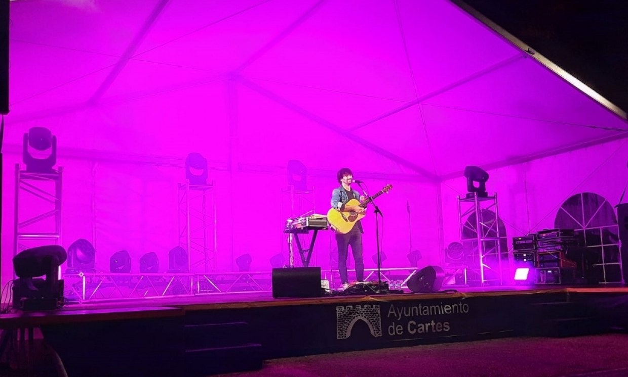 Durante la hora y cuarenta minutos que duró el concierto encadenó temas de su pasada época en El Canto del Loco y canciones propias de su época en solitario. Letrista, cantante, bajista y guitarrista se ha formado con ahínco para disfrutar de lo que le gusta y sin pensar en llenar estadios. Como él mismo dijo, "cuando los artistas pierden la intimidad y piensan en el negocio, se les va la magia". Y lo demostró en Cartes, llenando los jardines medievales de buen ambiente, buena música y solidaridad, según señaló el Ayuntamiento, colaborador de la asociación en la organización.