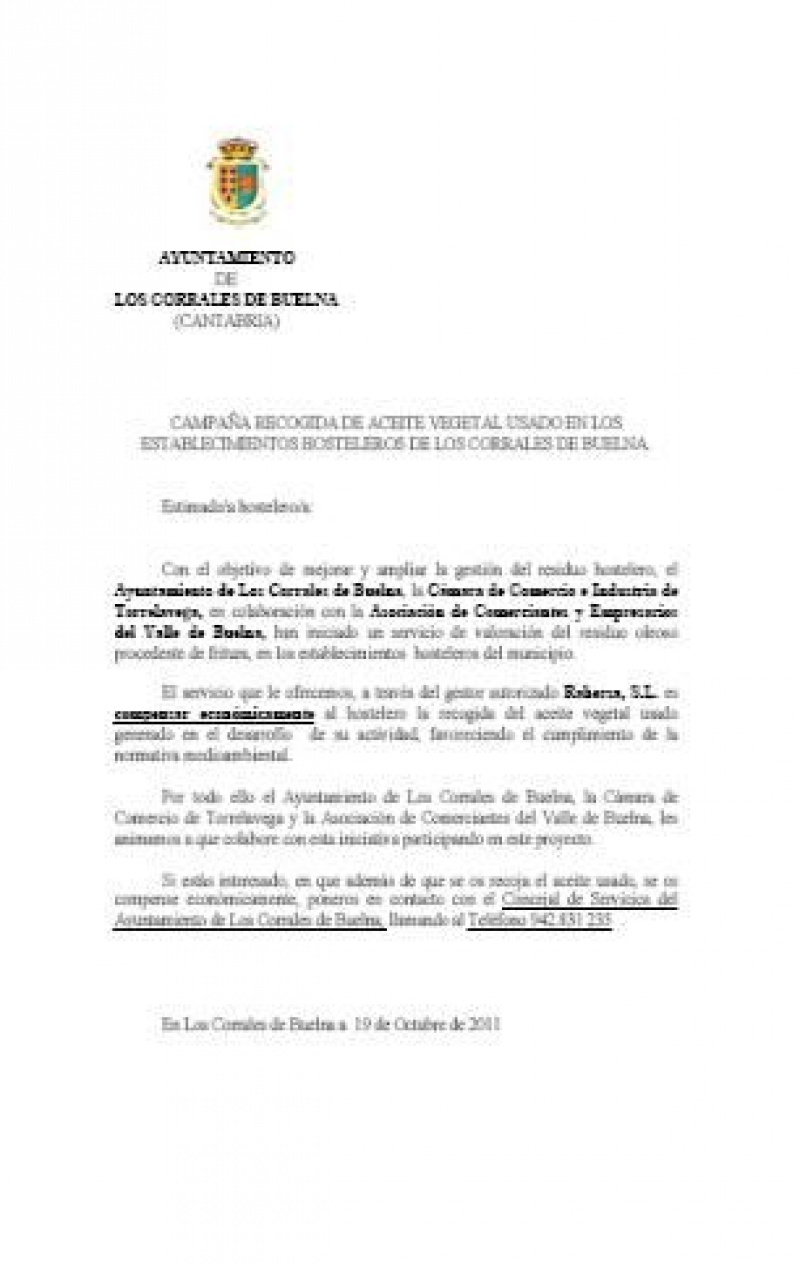 El Ayuntamiento ha iniciado la remisión de una carta a todos los hosteleros del municipio a través de la Asociación de Comerciantes y Empresarios del Valle de Buelna para ofrecer la posibilidad de unirse a la campaña de recogida de aceite vegetal usado. El concejal de Servicios, Joaquín Espinosa, señaló que desde esta semana se podrán inscribir en el Ayuntamiento y a partir de ahí se les pondrá en contacto con la empresa Rahersa, encargada de gestionar la recogida, establecimiento por establecimiento, del aceite vegetal usado.