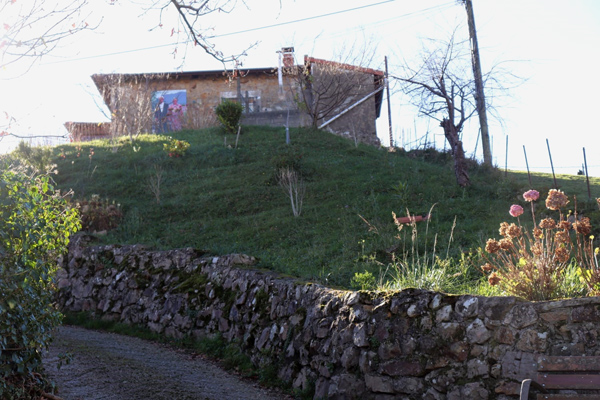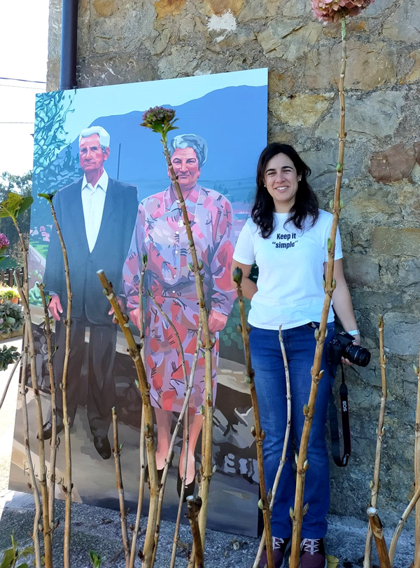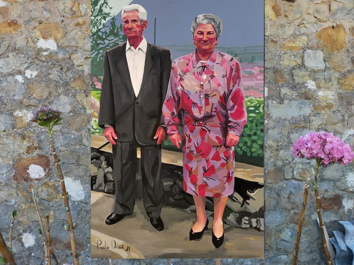 En este caso, la imagen de los abuelos se ve desde el camino de subida a los números impares del barrio de La Cuesta, siguiendo el itinerario habitual de la San Silvestre corraliega, y muestra a Pablo Saiz y Carmen Lavín, ganadero él, ama de casa ella. Los dos están arreglados para un día de fiesta, con sus mejores galas, saliendo para el evento desde su casa, la misma en la que esta ahora el retrato.
