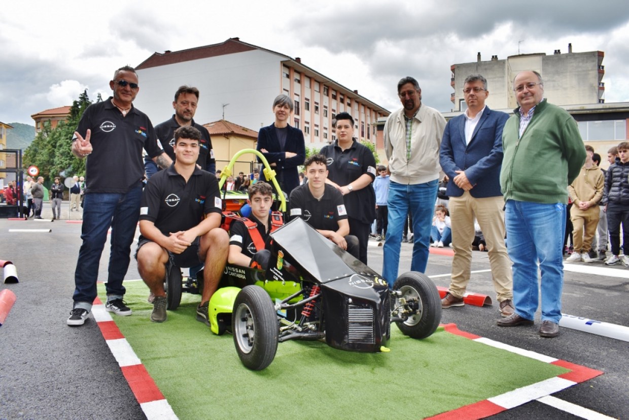 El patio del colegio corraliego sirvió de circuito de pruebas para la puesta de largo de un vehículo diseñado y montado por los alumnos y profesores del ciclo formativo de Automoción y que ha contado con la experiencia y colaboración de Nissan Cantabria. También han participado en el proyecto la Concejalía de Industria del Ayuntamiento de Los Corrales de Buelna y la Consejería de Educación y Formación Profesional. Y los alumnos del Grado Medio de Actividades Comerciales, encargados de promocionar el vehículo.
