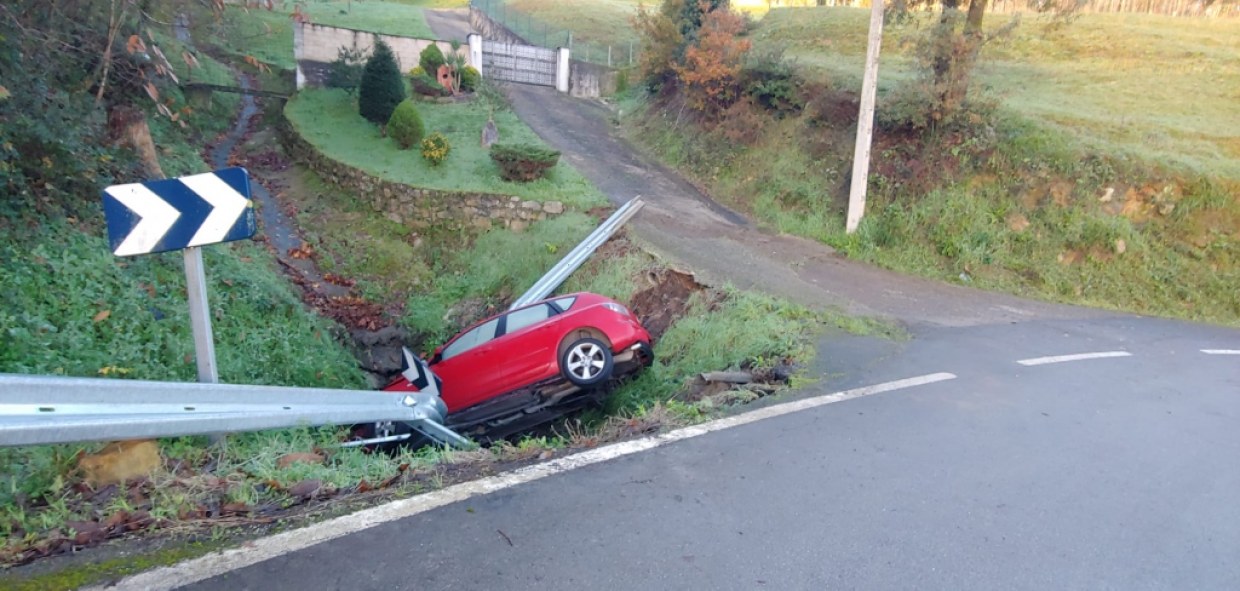 Este fin de semana tuvo lugar un aparatoso accidente en la carretera de acceso a Collado de Cieza desde Los Corrales de Buelna, muy cerca del arranque de esa empinada vía. El vehículo se salió de la calzada y cayo sobre la pendiente derecha de la falda de esa montaña, sobre el cauce de un pequeño arroyo, arrastrando las barreras de la carretera
