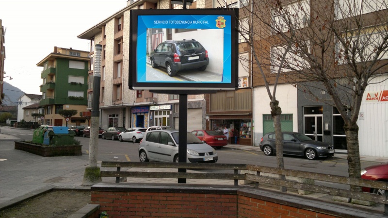 Desde ayer martes día 27, el cartel muestra datos de la calidad del aire, pero desde esta misma mañana su cara norte ya es utilizada por el nuevo servicio de Fotodenuncia Municipal. Desde ahora, la entidad local exhibirá durante 7 días las imágenes más destacadas de incumplimientos de sus ordenanzas: coches mal aparcados, peatones que crucen con semáforo en rojo, perros que realicen sus defecaciones en la vía pública e incluso mala utilización de los contenedores de basura.
