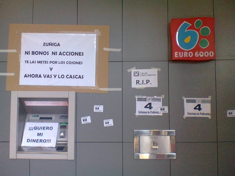 En la mañana de ayer lunes, y mientras tres representantes de la Plataforma de Afectados por las Participaciones Preferentes daban una rueda de prensa para hacer balance de un año de lucha e informar de las nuevas acciones a desarrollar por el colectivo, un grupo de afectados se desplazó hasta Torrelavega para "Cantar las Marzas” en nueve sucursales bancarias, tanto de Caja Cantabria-Liberbank, como de Caja Madrid-Bankia.