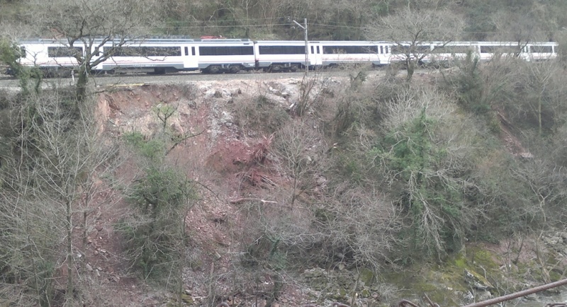 La línea férrea de Renfe se vio afectada ayer por un desprendimiento de tierras en la base de las vías del tren, a su paso por Riocorvo, en el municipio de Cartes. El argayo se produjo en la ladera del monte, a la altura de la antigua fábrica de harinas, obligando a los trenes a pasar por ese lugar a una velocidad muy reducida. Se trata de una zona muy afectada por los últimos temporales y la fuerza del río Besaya a su paso, según los vecinos de la zona, que alertan de la inestabilidad del terreno desde Riocorvo a Las Caldas.