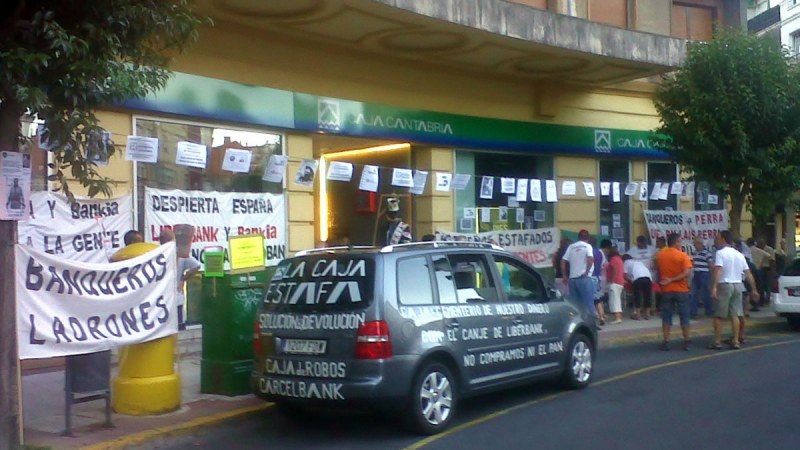 A lo largo del día de ayer, los afectados por las preferentes se han ido turnando en su acampada frente a la oficina principal de Caja Cantabria en la localidad, llegando a última hora de la tarde a formar un grupo aproximado de medio centenar de personas que ha recibido el apoyo de todos los vecinos y visitantes de la localidad que transitaban por la zona.