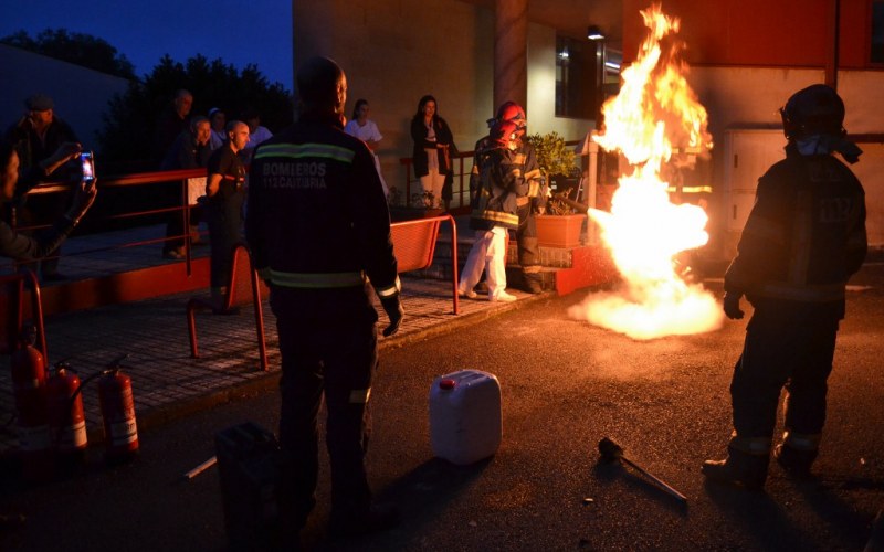 Ya por la tarde la charla se trasladó a los mayores de la residencia de Los Corrales de Buelna, donde además se hizo una demostración del funcionamiento de los extintores y su uso en caso de incendio. La elección de la residencia se debió al alto número de incidentes relacionados con el fuego en los que se ven involucrados mayores de 65 años, según estudios realizados por la Fundación Mapfre y la Asociación Profesional de Técnicos de Bomberos.